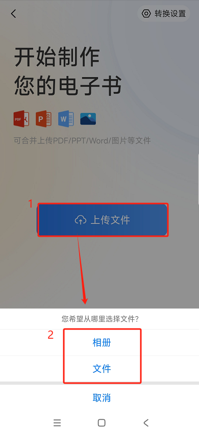 在首頁(yè),點(diǎn)擊【上傳文件】,隨后再點(diǎn)擊【上傳文件】,選擇文檔上傳,可合并上傳pdf/word/ppt/圖片等文件