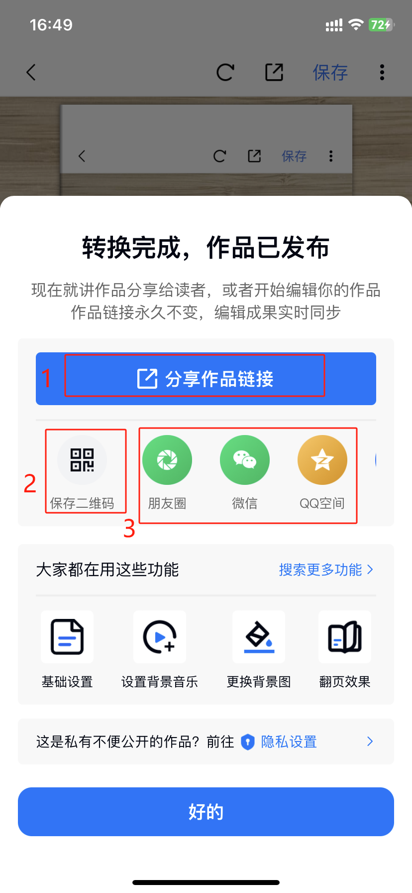 上傳轉(zhuǎn)換完以后,頁(yè)面會(huì)彈出:“轉(zhuǎn)換完成,作品已發(fā)布” 的提示界面。您可以將作品分享給他人查看。