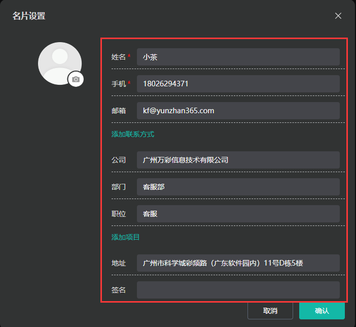 輸入名片信息,點擊確認。