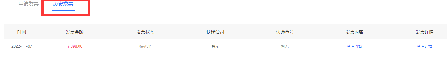 4、在歷史發(fā)票可以查看您申請(qǐng)的發(fā)票內(nèi)容,寄送單號(hào)等。