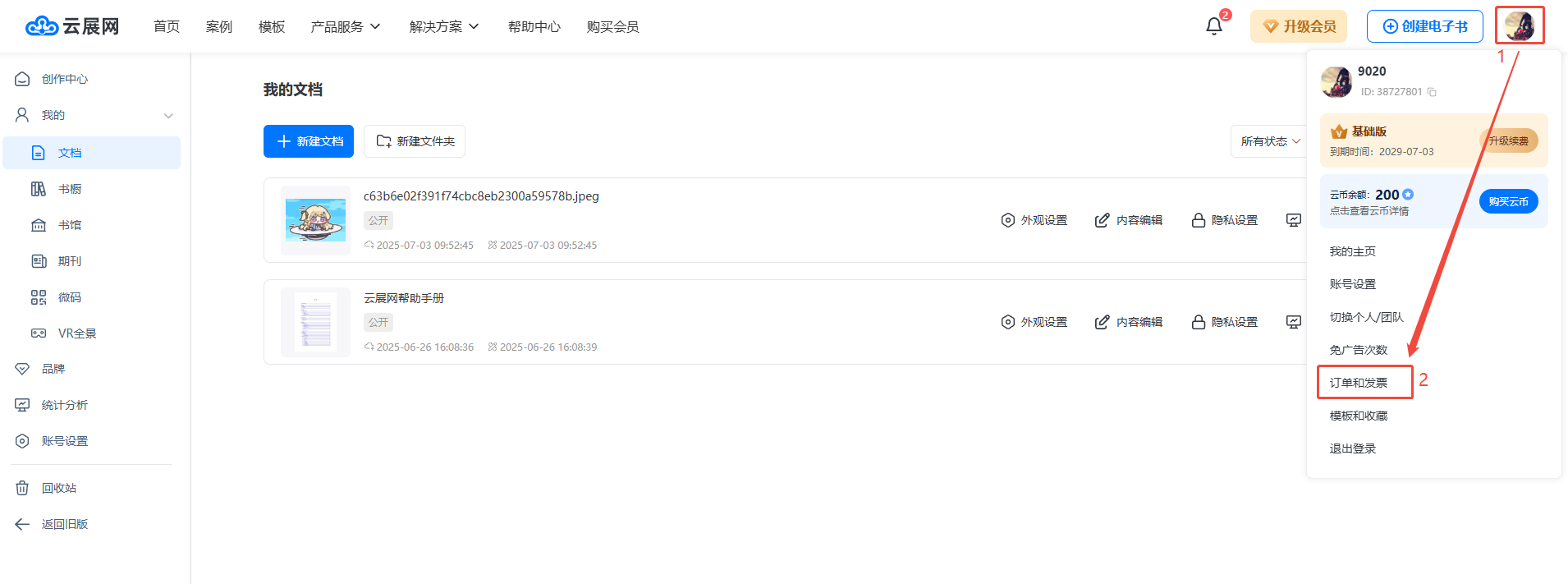 1、登錄云展網(wǎng)賬號(hào),然后點(diǎn)擊右上角頭像,點(diǎn)擊【訂單和發(fā)票】。