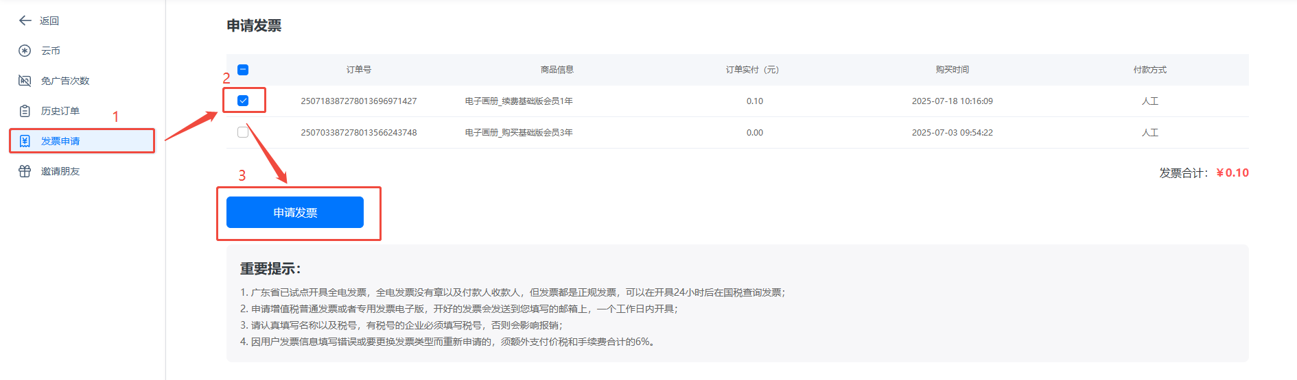 只要是在云展網(wǎng)支付了款項(xiàng),金額超過(guò)0.1元的訂單,都可以申請(qǐng)發(fā)票。