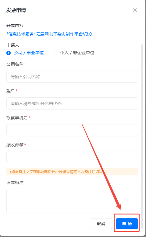 3、選擇發(fā)票類型,然后填寫(xiě)相關(guān)信息,如需在發(fā)票右下角備注文字或者補(bǔ)充地址電話開(kāi)戶行賬號(hào)的,請(qǐng)?jiān)诎l(fā)票備注欄上填寫(xiě),信息要確保無(wú)誤,避免影響報(bào)銷,填好以后下滑點(diǎn)擊【申請(qǐng)】。