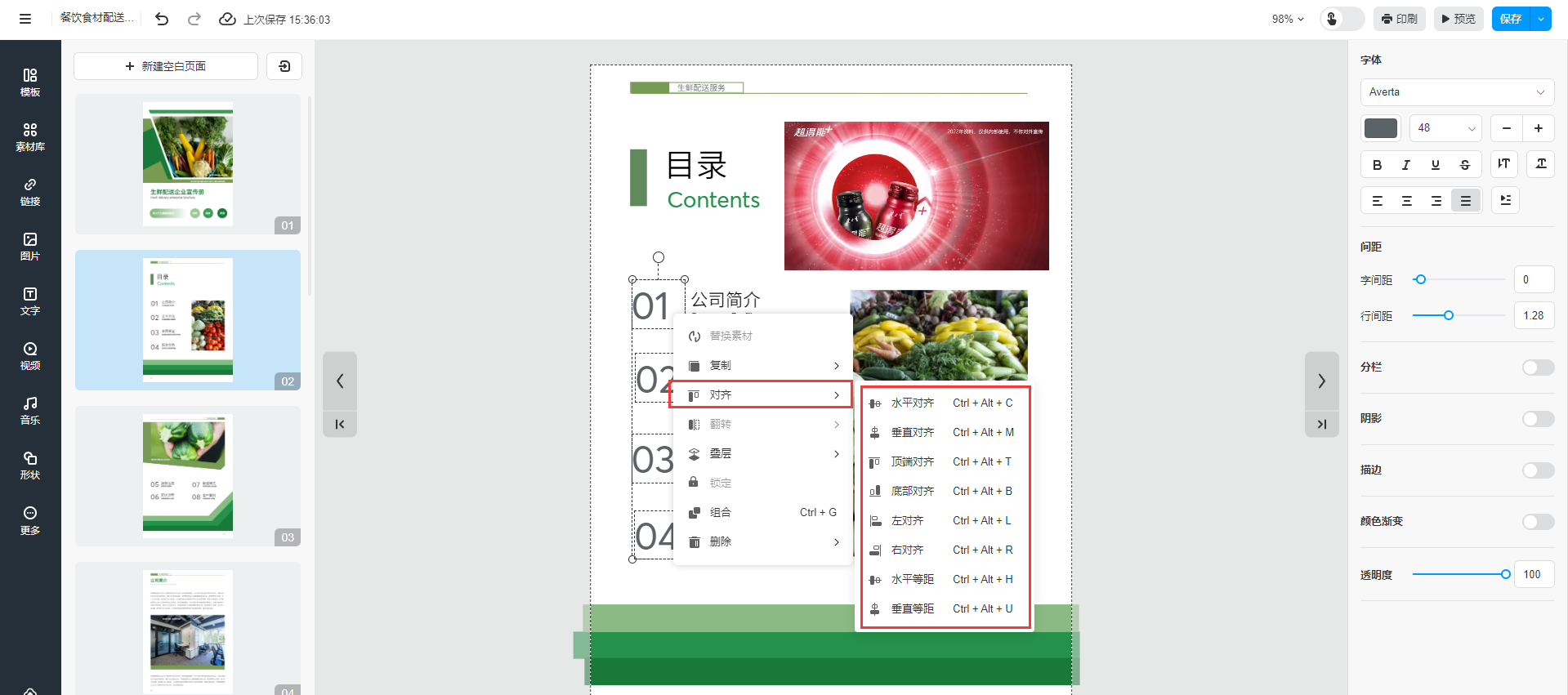 當(dāng)頁(yè)面中有多個(gè)素材/文本框需要對(duì)齊時(shí),可以通過(guò)設(shè)置文本框的對(duì)齊方式,輕松地將頁(yè)面內(nèi)容整齊排列。