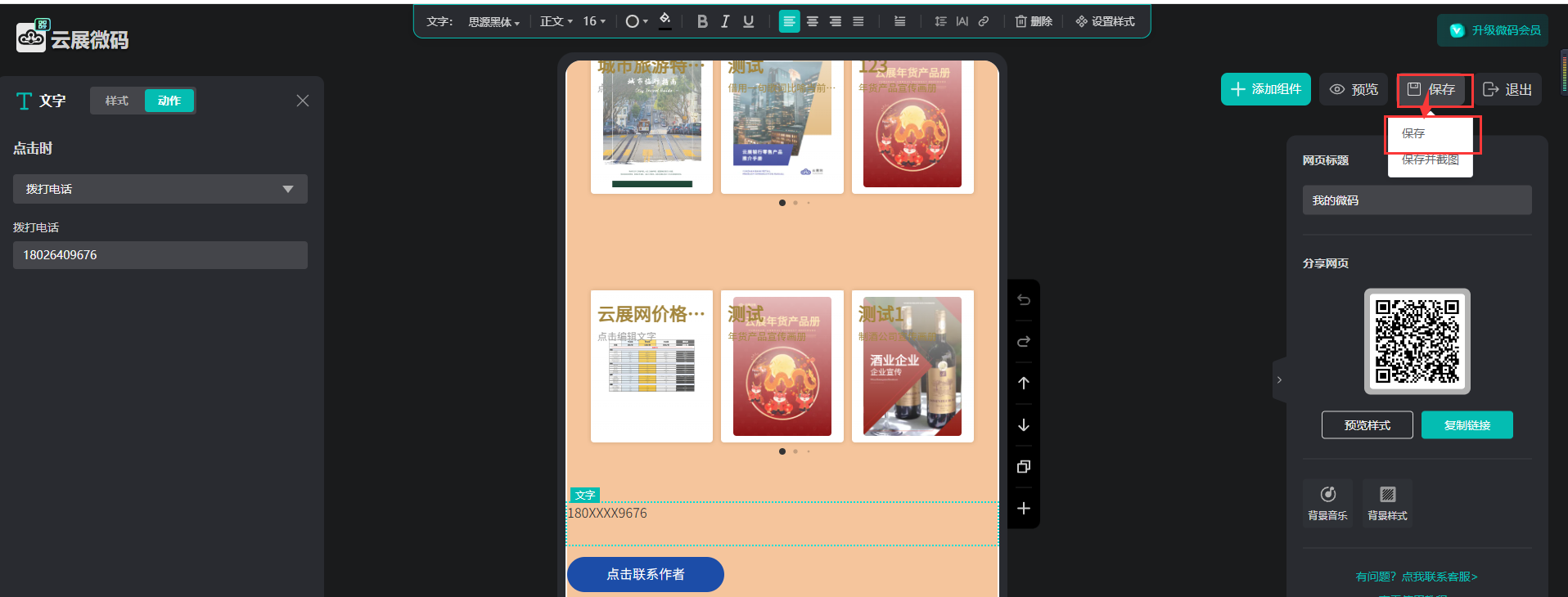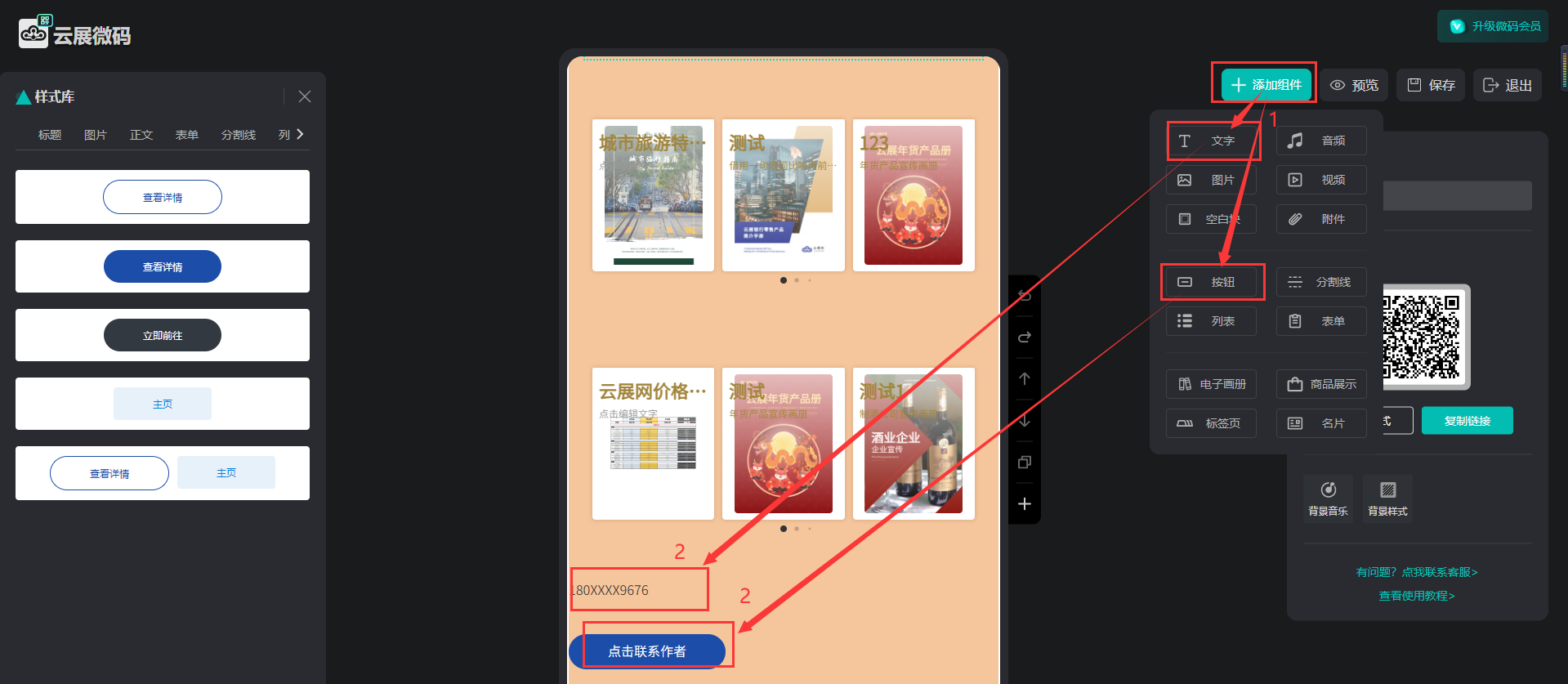 點(diǎn)擊【添加組件】,點(diǎn)擊【文字】或者【按鈕】,輸入聯(lián)系電話號(hào)碼/聯(lián)系作者