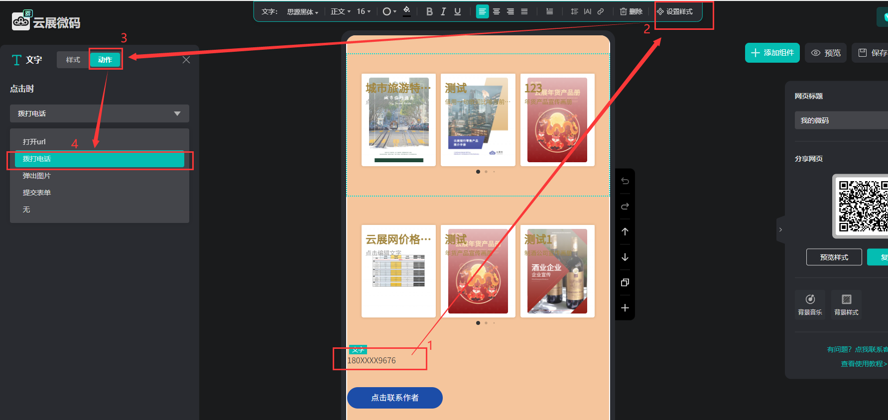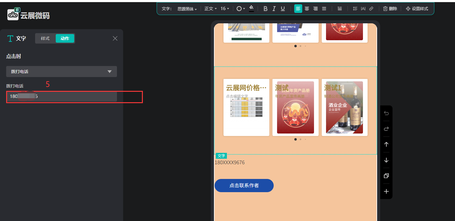 選中聯(lián)系電話號(hào)碼/按鈕,點(diǎn)擊【設(shè)置樣式】,點(diǎn)擊【動(dòng)作】,設(shè)置【撥打電話】,輸入聯(lián)系電話號(hào)碼