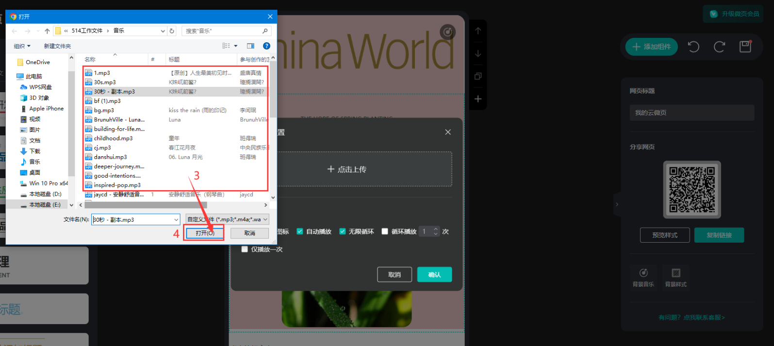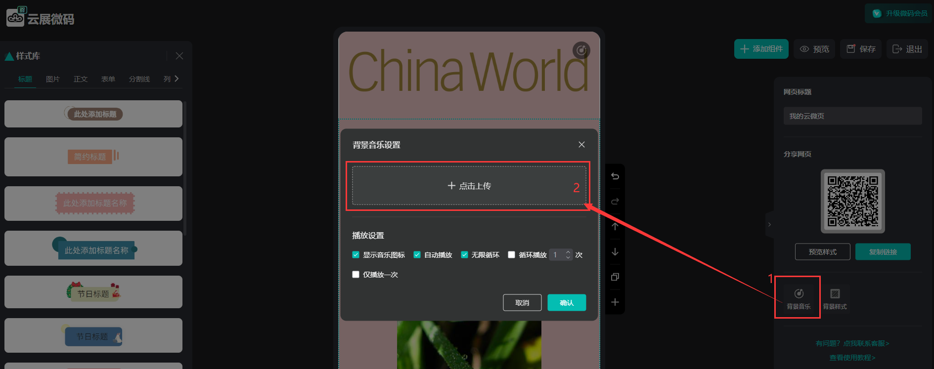 點(diǎn)擊【背景音樂(lè)】,【點(diǎn)擊上傳】,上傳MP3格式的音樂(lè)文件